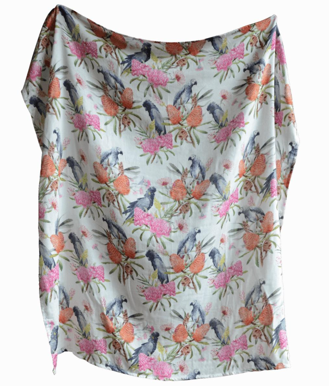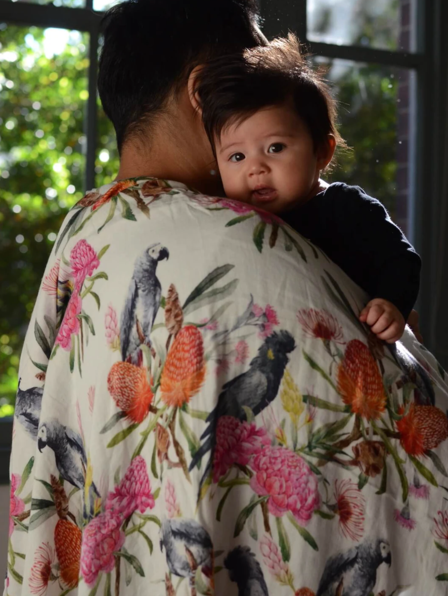 Teach your baby about Australian flora and fauna whilst keeping them cozy in the Banksia Swaddle. Trace your fingers over the feathers of the cockatoos as you teach them bird sounds.