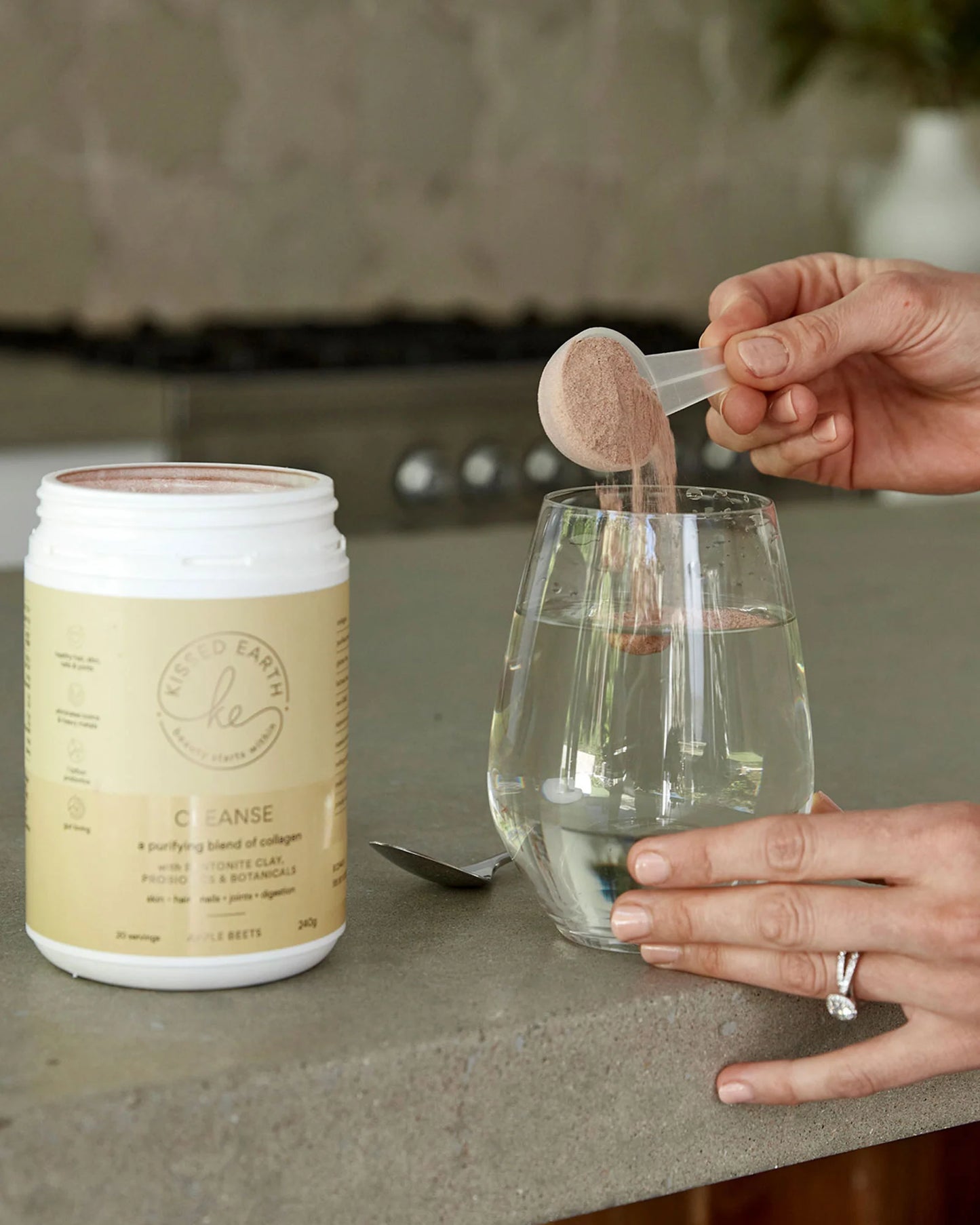 Kissed Earth Cleanse is our purifying beauty elixir that combines our signature collagen peptides with bentonite clay, probiotics and botanicals to help remove unwanted toxins and heavy metals and restore the gut. Cleanse works to support the body’s natural detoxification pathways and nourish the digestive system, allowing you to feel renewed and energised.